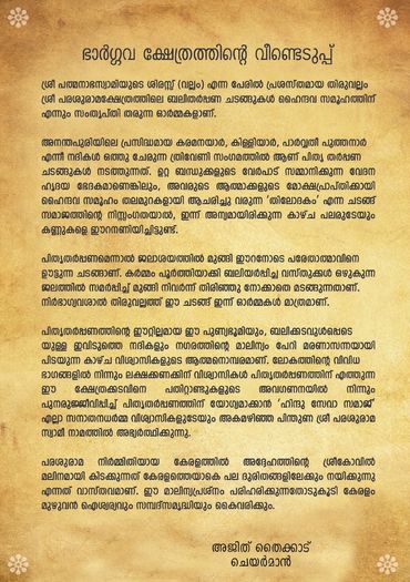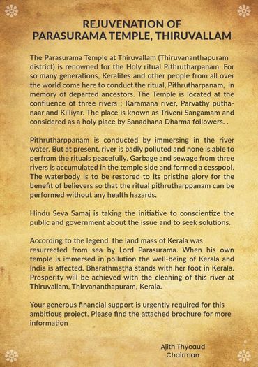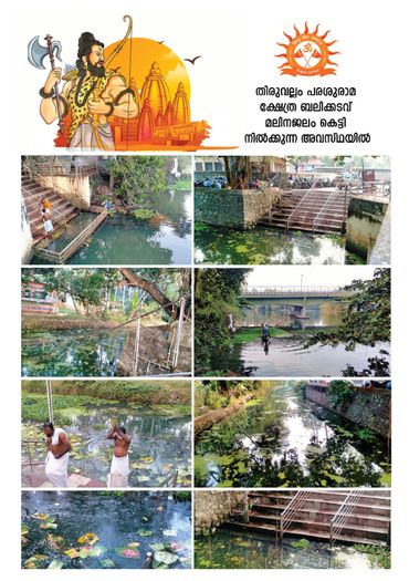 According to the legend the land mass of Kerala was resurrected from sea by Lord Parasurama. When his own temple is immersed in pollution the well being of Kerala and India is affected. Bharathmatha stands with her foot in Kerala. When prosperity will be achieved with the cleaning of this river at Thiruvallam, Thirvananthapuram, Kerala.